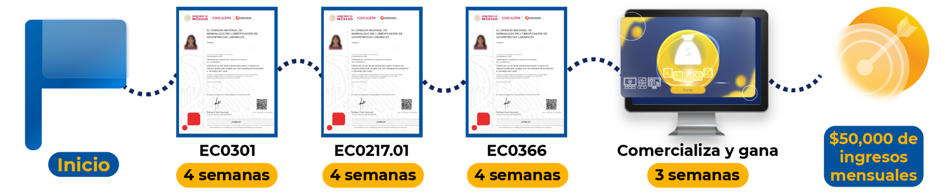 Aprovecha nuestra metodología clara y comprobada por nuestros estudiantes para poder certificarte en 8 pasos ante SEP-CONOCER y aprender cómo ganar tus primeros $50,000 mensuales en menos de 15 semanas iniciando desde cero.